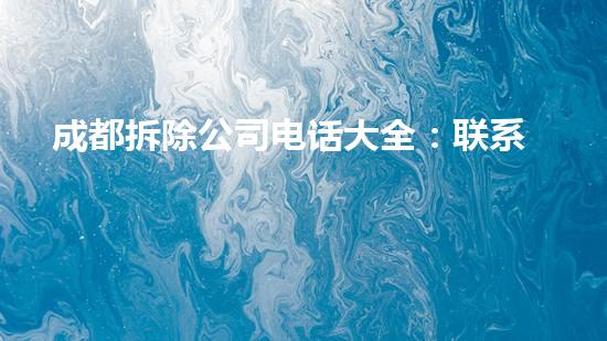以上是成都拆除公司电话大全,这些公司都是成都地区具有专业技术、诚信经营的拆除公司,能够为您提供快捷、高效、安全、环保的拆除服务。如果您需要拆除公司的帮助,请随时联系以上公司,他们一定能够帮助您解决问题。