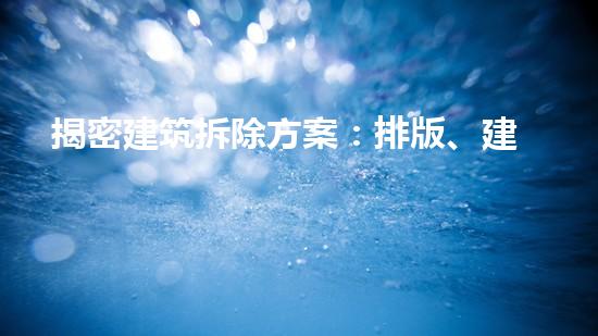 建筑拆除是一项复杂的工程,其中涉及到多个环节的协调和配合。本文将从排版、建筑、插画、素材四个方面,为读者揭秘建筑拆除方案,深入解析该行业的各个细节。通过对巴洛仕集团化工厂拆除的案例研究,详细讲解了拆除前的清洗置换、设备回收、污泥减量化等过程,以及巴洛仕不动火水刀切割拆除技术的应用。本文旨在提供更深入的理解,帮助读者更好地认识建筑拆除的流程,并增进对该领域的专业知识。