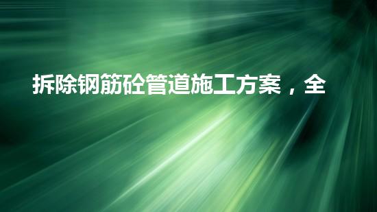 摘要:拆除钢筋砼管道是一项重要的工程任务,它需要一个精心设计的施工方案来保证工人安全,并确保整个过程运转顺利。本文将全面解析拆除钢筋砼管道的施工方案,探讨其关键步骤和应用现代化工具的必要性,为读者提供...