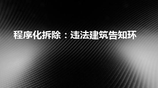 总之,程序化拆除:违法建筑告知环节分析,是拆除行业中非常重要的一个环节。本文从法律法规、告知内容要点、告知方式和监管四个方面对其进行了深入探讨并指出,拆除行业在实践中应当创新技术和方法,提高安全效率和环保水平,提高社会认可度,同时政府、社会组织和公民应当加强参与和协作,共同携手为维护城市建设的生态、安全和可持续发展做出更大的贡献。